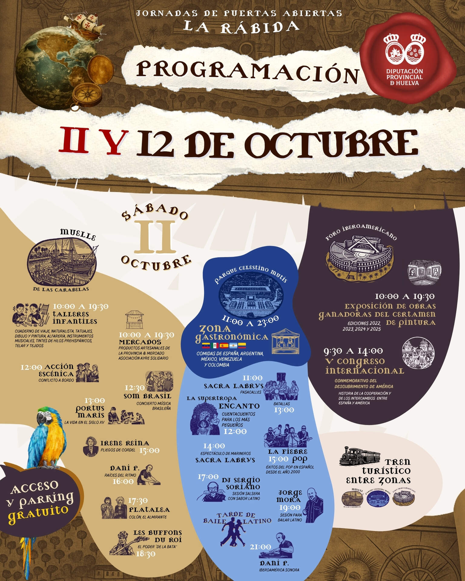La Diputación Provincial de Huelva, a través de la Unidad de Gestión de La Rábida, ha diseñado una atractiva programación para acompañar las Jornadas de Puertas Abiertas del Muelle de las Carabelas, que se celebrarán los días sábado 11 y domingo 12 de octubre de 2025, en horario de 09:30 a 23:00 horas (según espacios), con motivo de la celebración del Día de la Hispanidad.