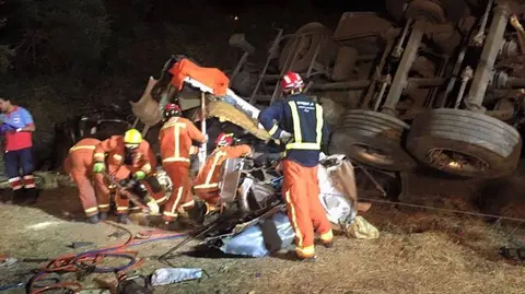 Los bomberos han acudido para extraer el cuerpo del conductor que habría quedado atrapado entre los barrotes de la cabina. El camión no transporta mercancías peligrosas