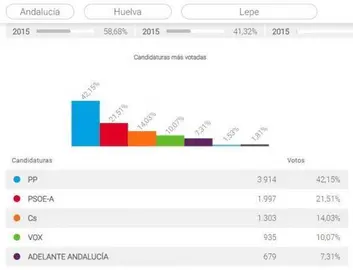En la comarca gana el Partido Popular con 8.595 seguido del PSOE con 6.826, Ciudadanos con 4.519, Adelante Andalucía 3.150 y sorprende la potencia de VOX con 2.974 votos en esta zona.