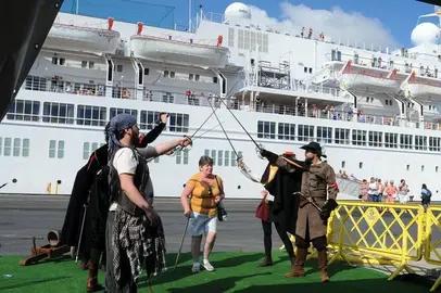 Los viajeros han sido recibidos con teatro y vino del Condado en el Muelle Sur, y disfrutan de una soleada estancia en la ciudad y otros puntos de la provincia antes de partir hacia Málaga