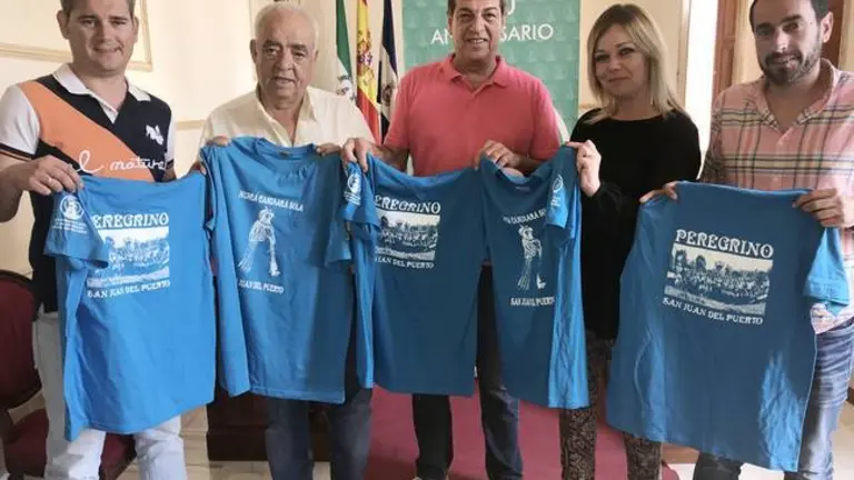 El equipo de gobierno ha hecho entrega a los peregrinos que acompañan este miércoles y jueves a la Hermandad sanjuanera de las camisetas con la imagen corporativa.