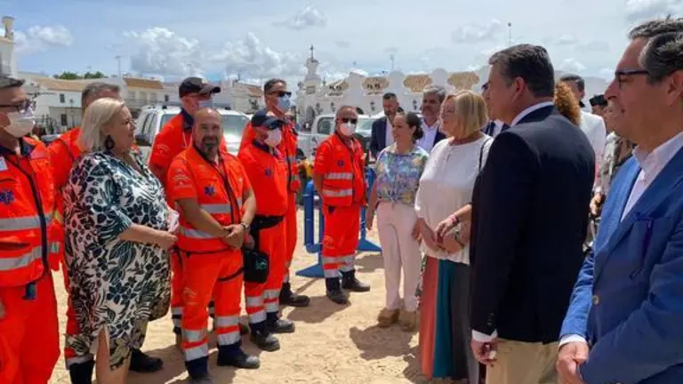 El presidente Juanma Moreno y dos consejeros desembarcan en El Rocío en busca del voto
