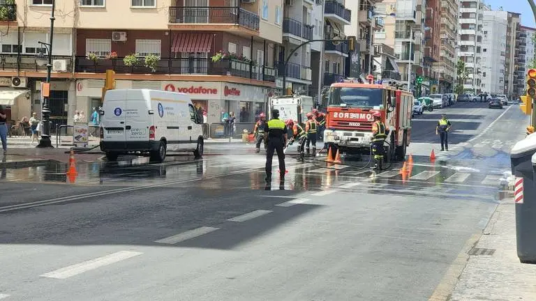 Los Bomberos de Huelva han tenido que paralizar el tráfico para emprender la recogida del aceite del motor de una barredora municipal que estallaba por motivos que aun se desconocen.