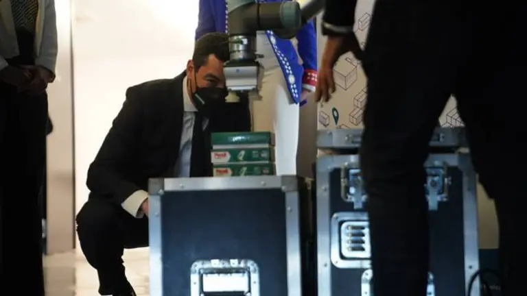 El presidente de la Junta de Andalucía, Juanma Moreno, ha inaugurado este miércoles la ‘Lonja de la Innovación’, puesta en marcha por el Puerto de Huelva y la compañía Telefónica.
