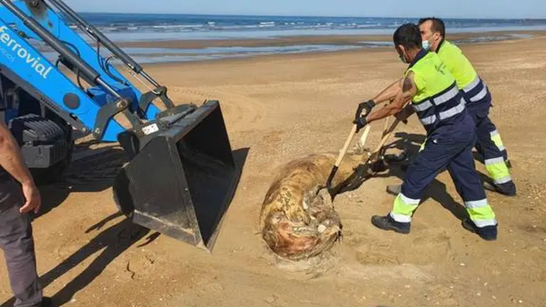 Los técnicos de limpieza han procedido al enterramiento tras el cual se han realizado labores de limpieza y movimiento de tierras con el objetivo de devolver la normalidad del paisaje playero del...