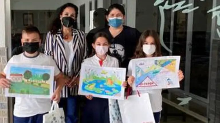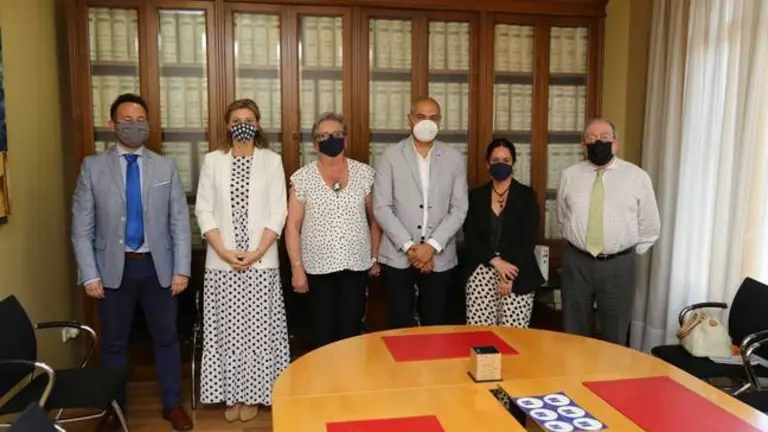 El presidente de la Real Hermandad de Emigrantes de Nuestra Señora del Rocío de Huelva, Francisco José Garrido; la secretaria, Carmen Benito; y por parte del Banco Sabadell su apoderada, Rosario de...