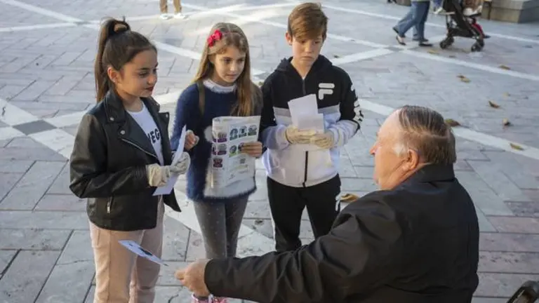 Un grupo de menores rodea con tiza los residuos de varias calles del centro de Huelva y habla con los viandantes para poner el foco en la importancia de cuidar el entorno