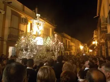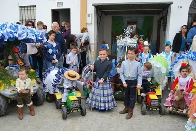 En el cortejo del Rociito no faltan ninguna de las insignias, banderas, estandartes y varas que desfilen delante del simpecado portado en una carreta de bueyes en miniaturas