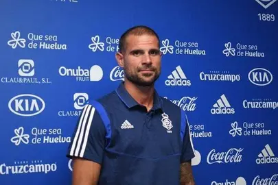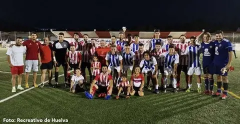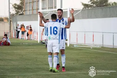 El único delantero centro del Decano marca su primer tanto como albiazul desde que llegara a Huelva en marzo. Le acompañan Quique Rivero, Morcillo y Jesús.