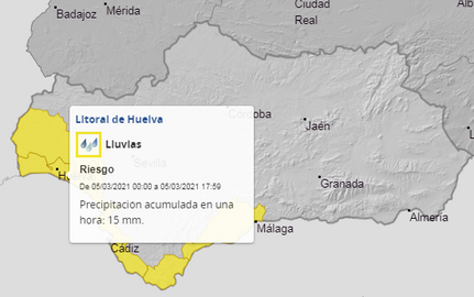 Las zonas afectadas serán el Andévalo, el Condado y el litoral de la provincia (probabilidad de lluvia de entre el 40 y 70%) llegando a caer precipitaciones en una hora de 15 mm.