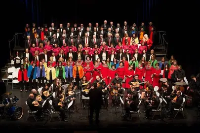 Tres corales, un orfeón y una orquesta, con 200 artistas ciegos en el escenario, despiden en Huelva la mayor movilización cultural de la ONCE.