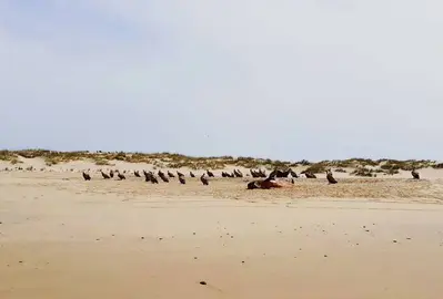 La imagen es insólita ya que los buitres no suelen acercarse en grandes grupos a la playa