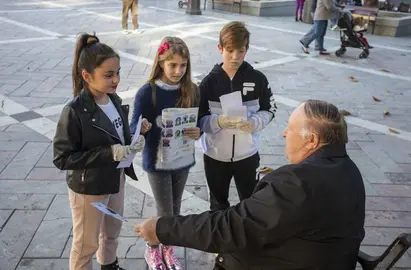 Un grupo de menores rodea con tiza los residuos de varias calles del centro de Huelva y habla con los viandantes para poner el foco en la importancia de cuidar el entorno