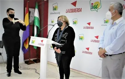 La portavoz de la confluencia de Izquierda Unida y Podemos, Mónica Rossi, junto al presidente de la Asociación Cultural de Personas Sordas de Huelva, Juan Martínez, se han dirigido hoy al alcalde de…